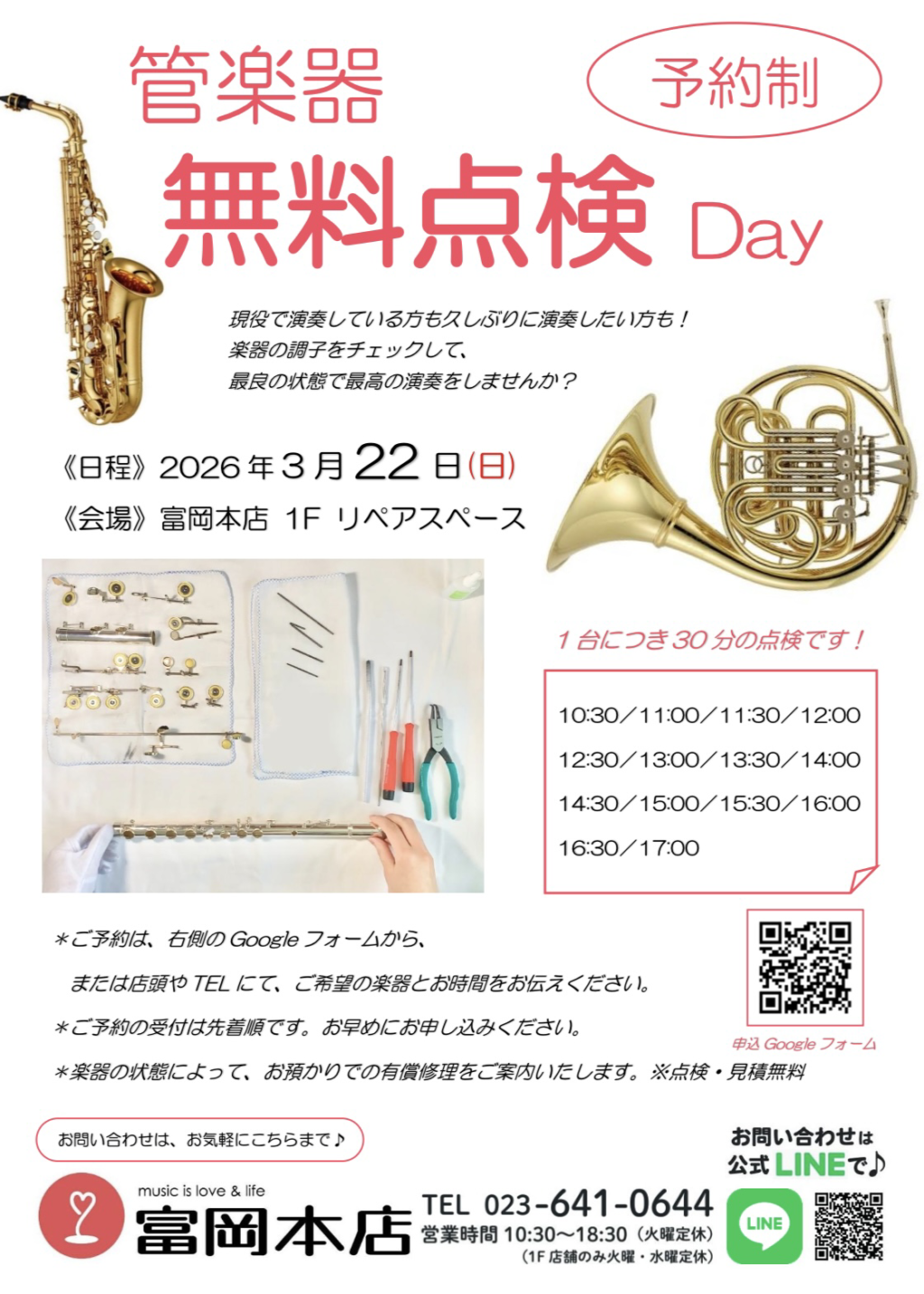 大好評につき、3/22㈰に管楽器無料点検DAYを開催いたします!